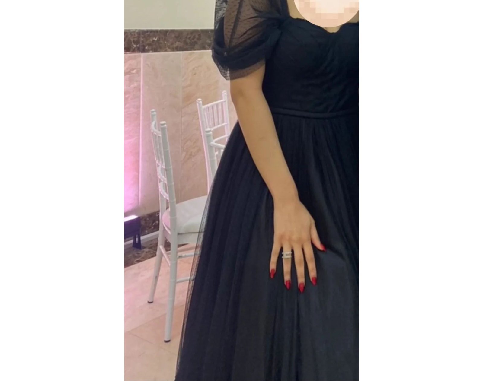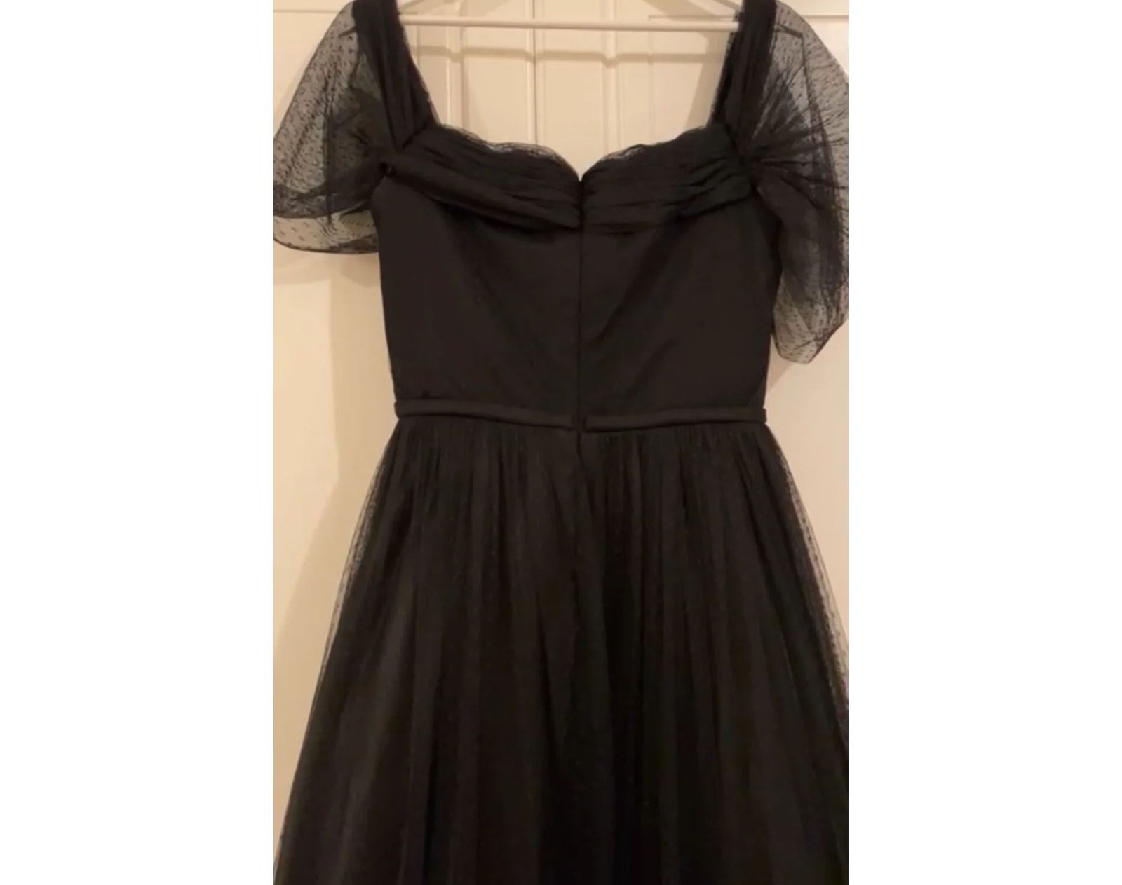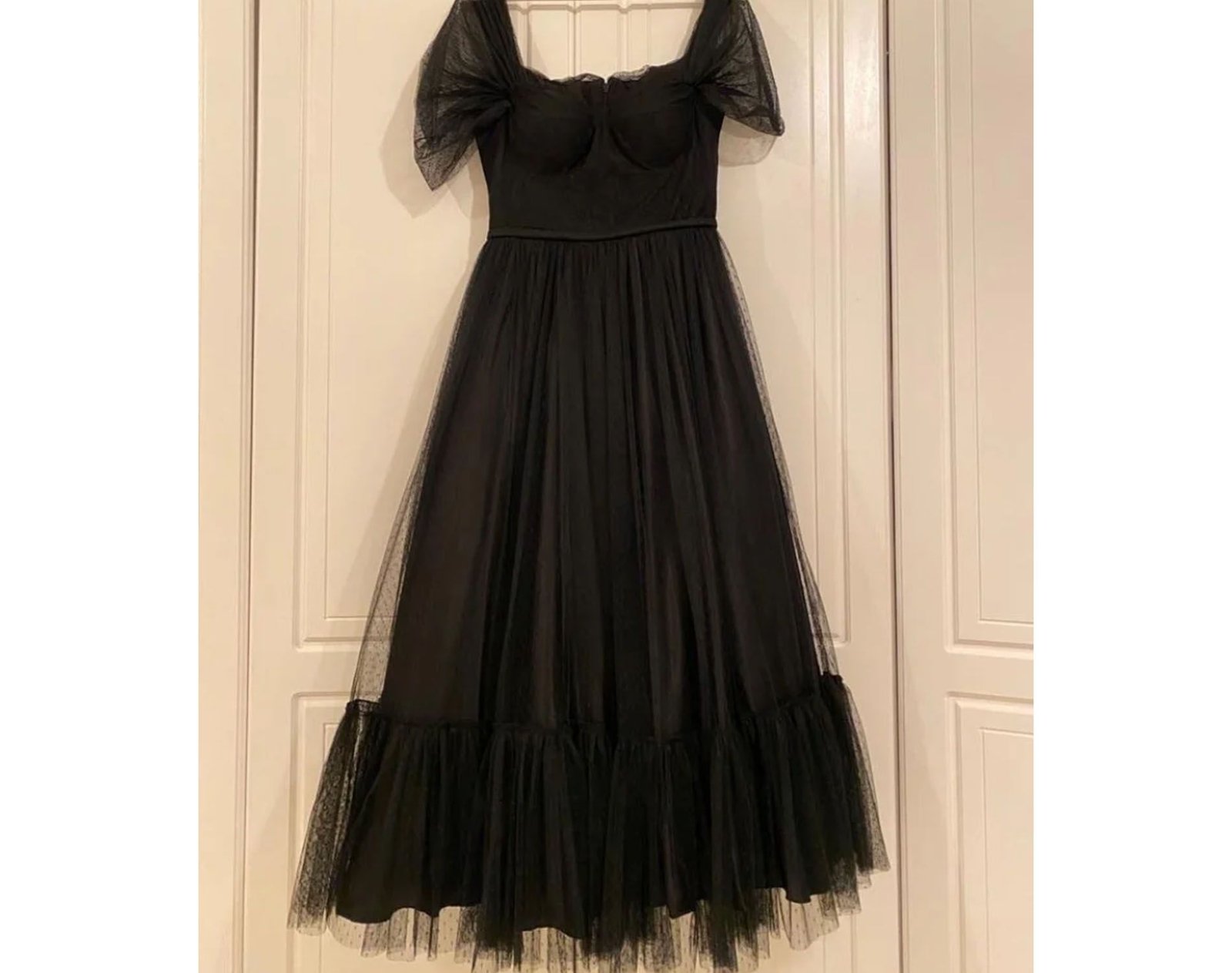 This is a black wedding dress made from delicate tulle fabric. It features a single-piece design with a fitted, sweetheart bodice and short puff sleeves made from sheer tulle. The ruffled hem at the bottom enhances the gown’s romantic and ethereal aesthetic. This non-traditional black color gives the wedding dress a bold, modern twist.
