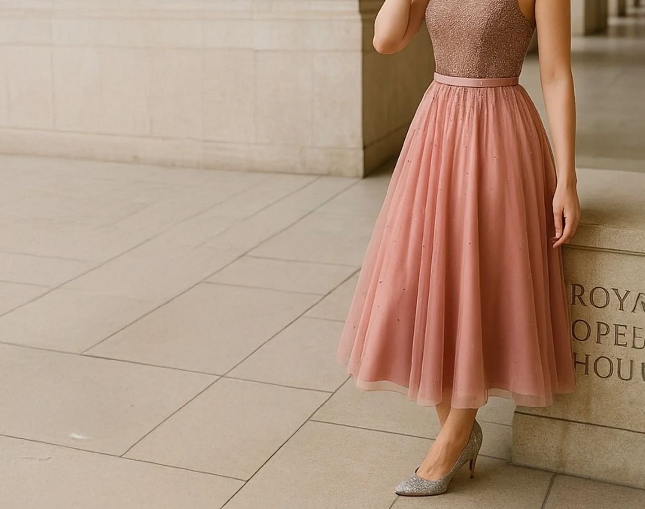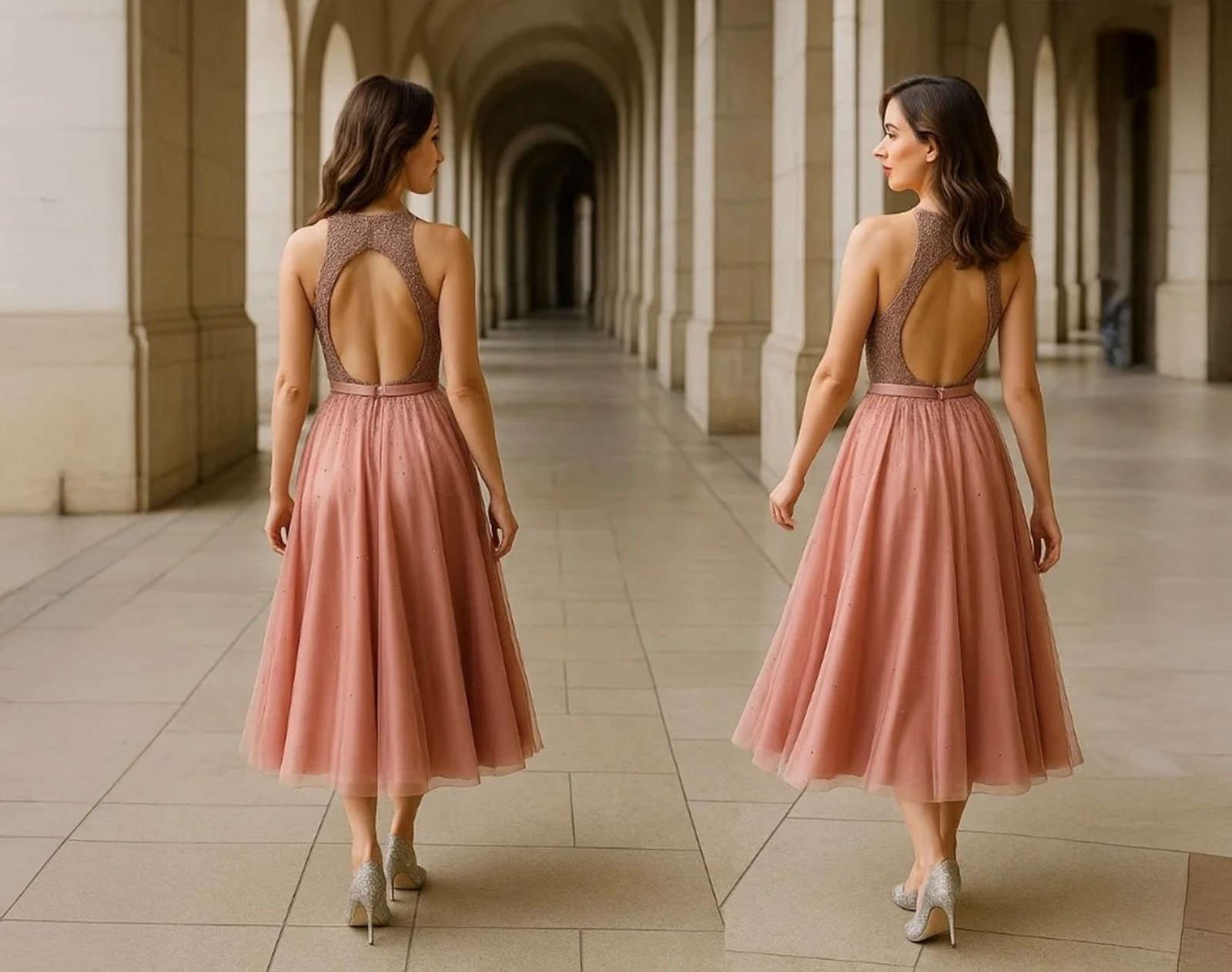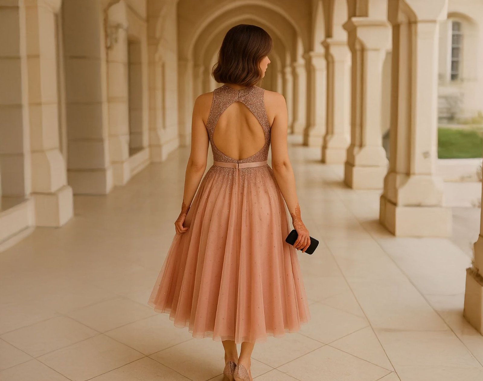 فستان سهرة وردي مذهب بكريستالات تصميم فاخر مقاس سمول
