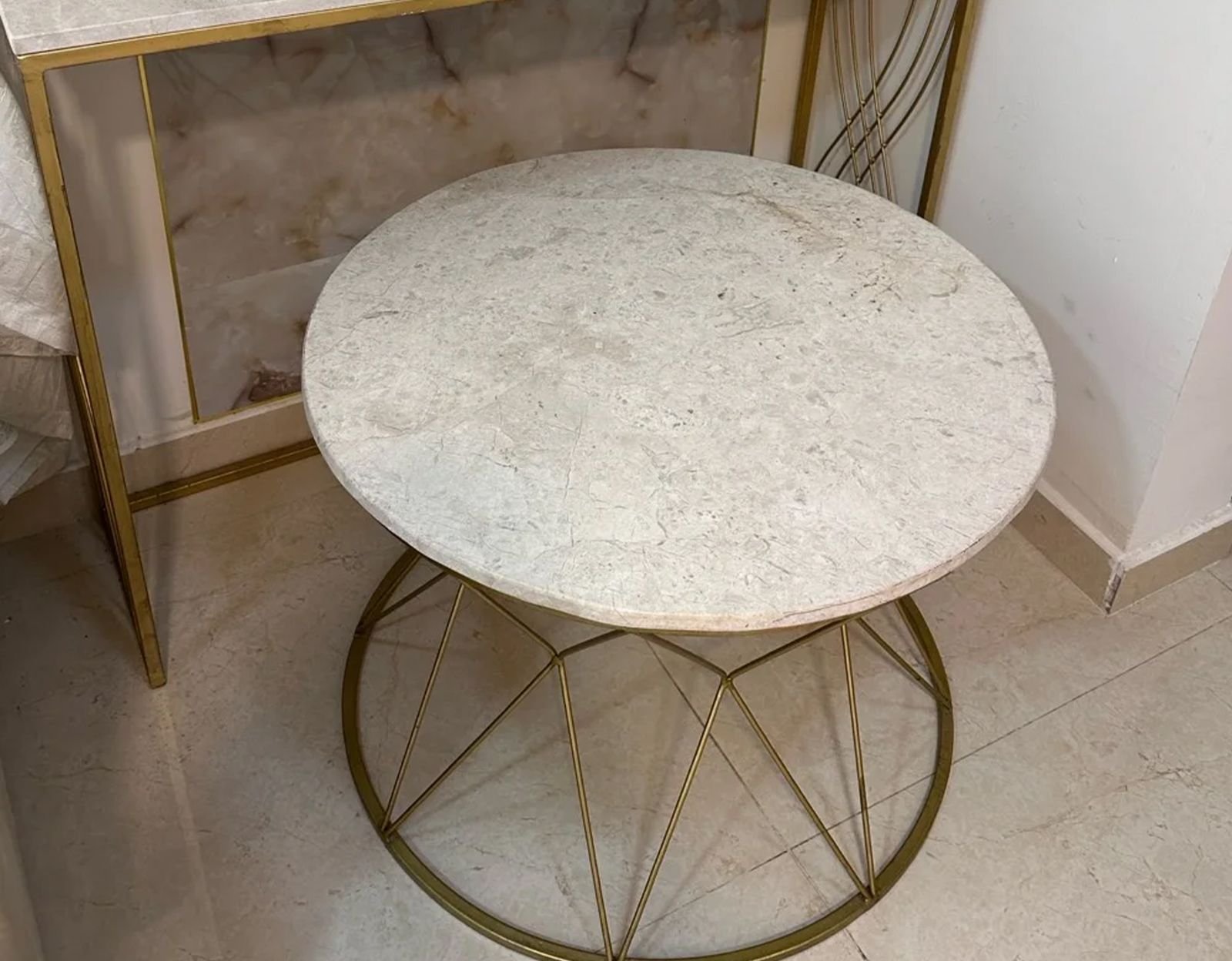 Rectangular (console) table and round table with light beige marble tops and golden metal bases.