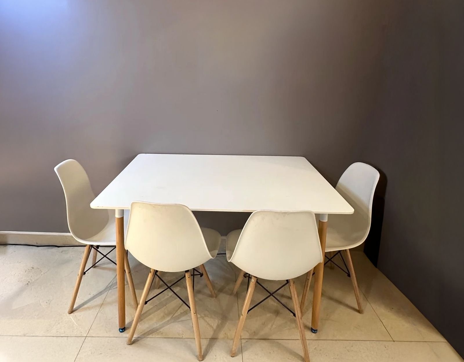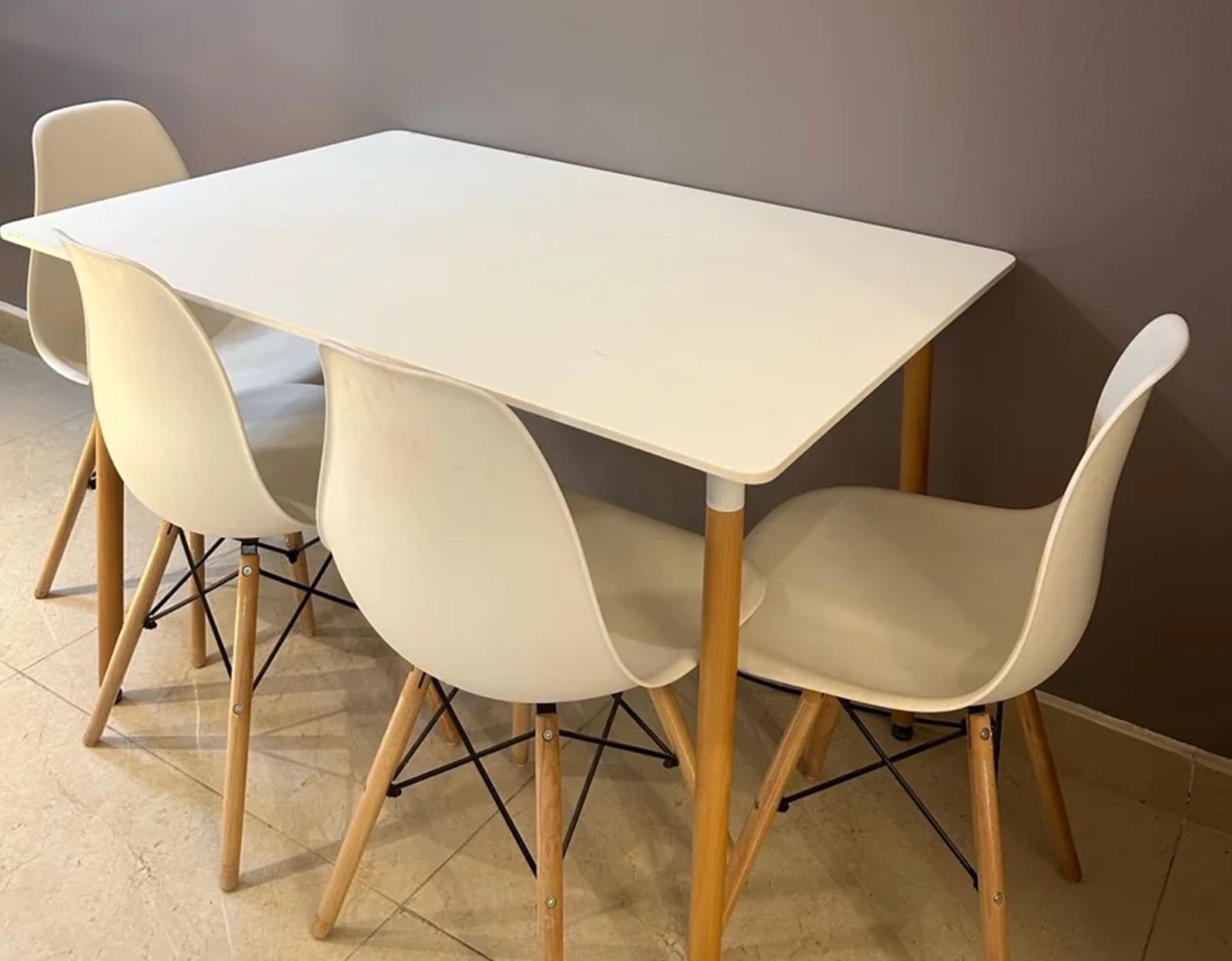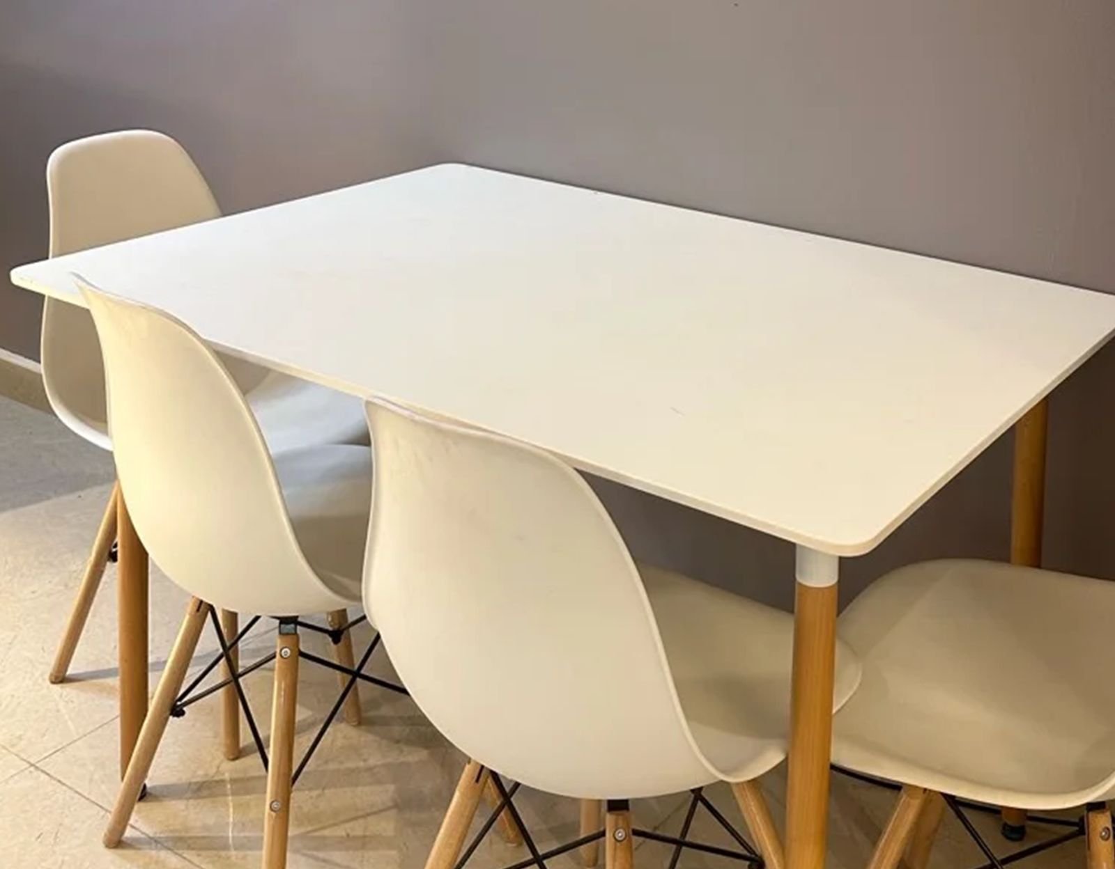 • Rectangular white table with 4 chairs featuring wooden legs