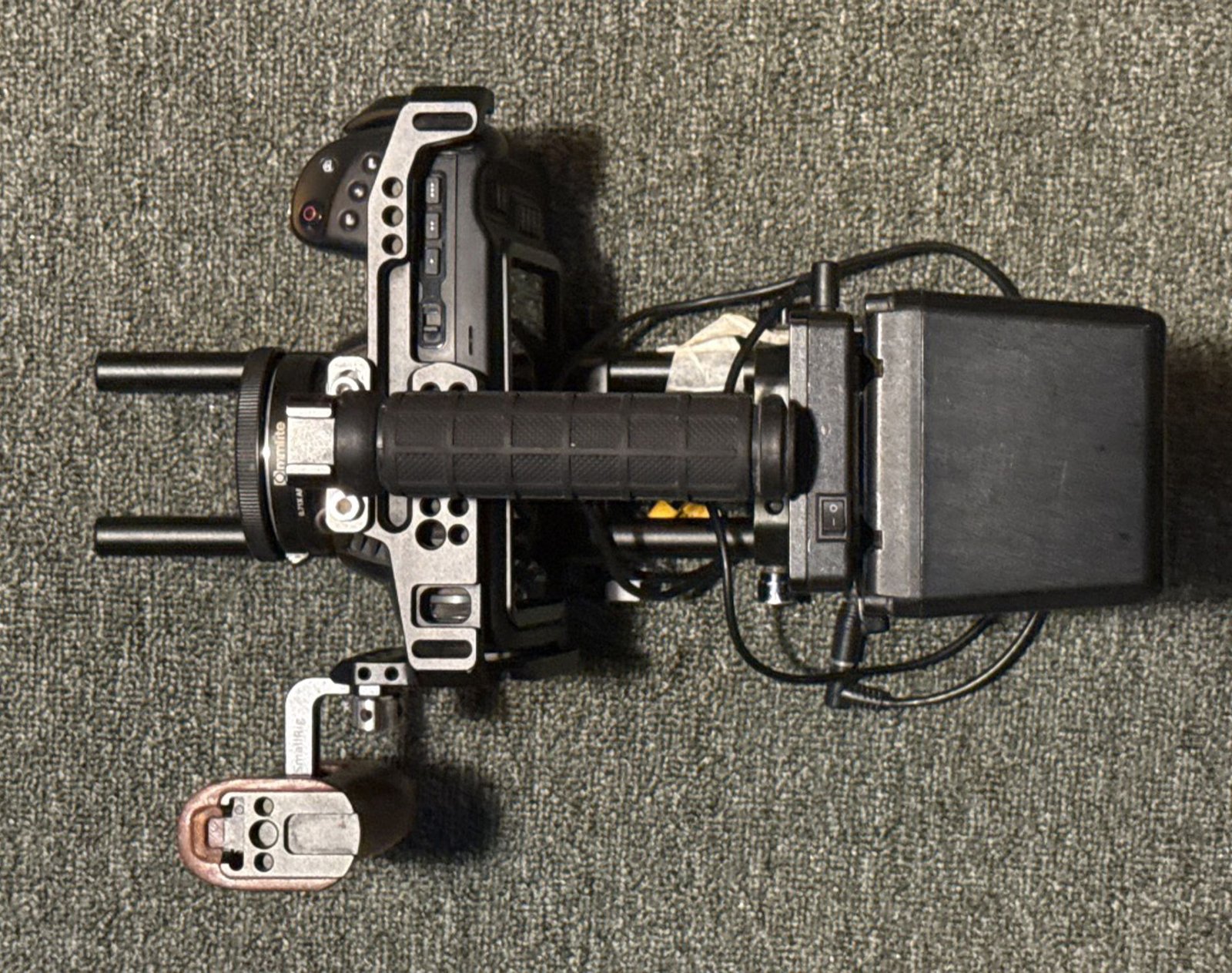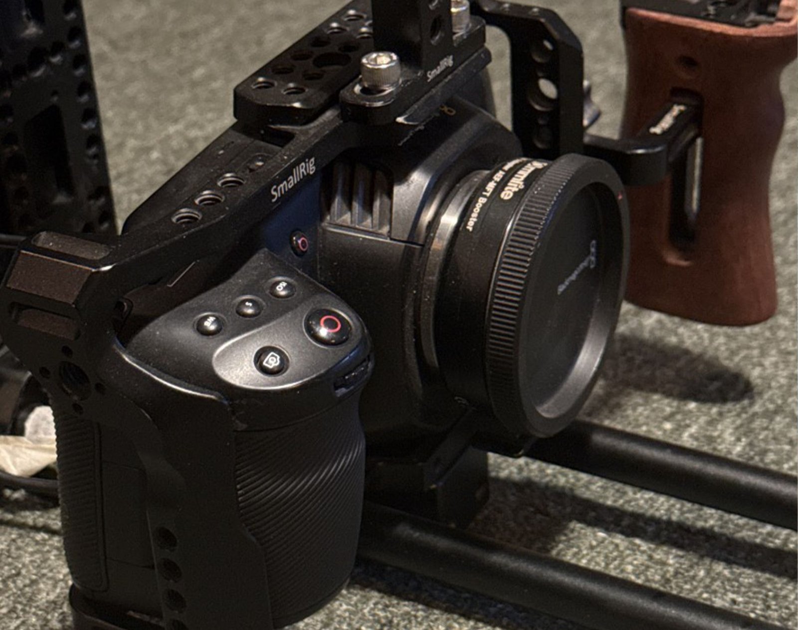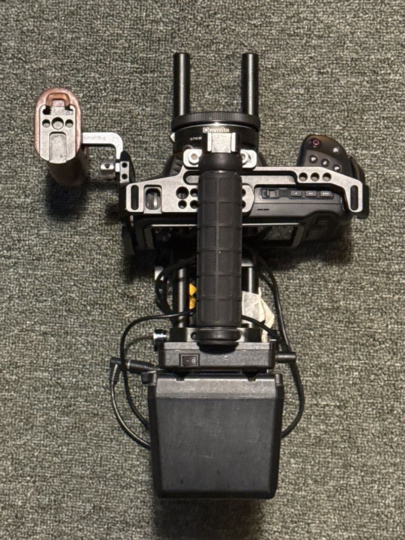 كاميرا بلاك ماجيك بوكيت سينما مع كيج SmallRig وبطارية V-Mount سعة 290، مع محول AEF إلى MFT (AEF-MFT Booster).